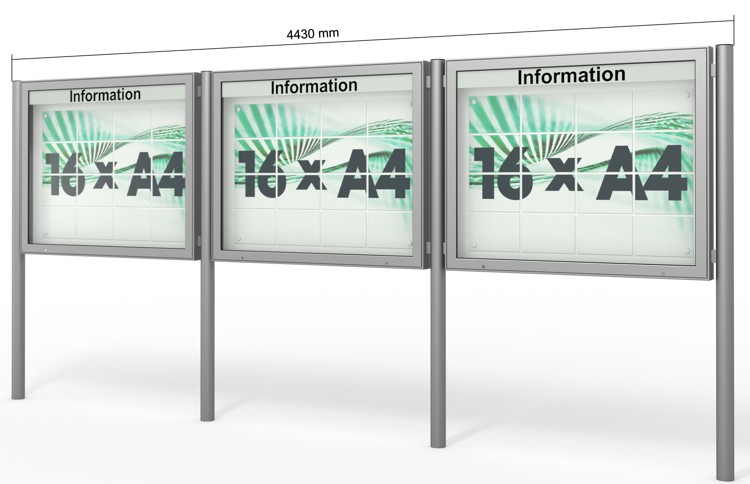 Schaukasten Plenum - eckig - 3er Sternanlage - beidseitig 123 mm Gehäusetiefe -wetterfester, robuster SchaukastenUmfangreiches Zubehör wie Beleuchtung und StänderGrößen B/H3 x 16 × DIN A4 • 1330 × 1080 mm oder3 x 21 × DIN A4 • 1600 × 1130 mm Oberfläche - Eloxierung in matt-silber (E6/EV1)Optionale Standbeine - Die Standbeine müssen 700 mm tief in Betonfundamente eingefasst werdenBeleuchtung – optionale LED-Langfeldleuchte Öffnung - Nach oben öffnender Klappflügel, unterstützt durch Gasdruckfedern mit automatischer Arretierung in geöffneter StellungVerglasung - Einscheiben-Sicherheitsglas / ESG Textblende - unbeschriftete, weiße Acryl-TextblendeSchließung - Sicherheitsschlösser mit je 2 SchlüsselnMontage - Vorgerichtet zur Wandmontage - freistehend mit runden Standbeinen zum EinbetonierenRückwand - weiße, magnethaftende Rückwand mit 10 Magneten
