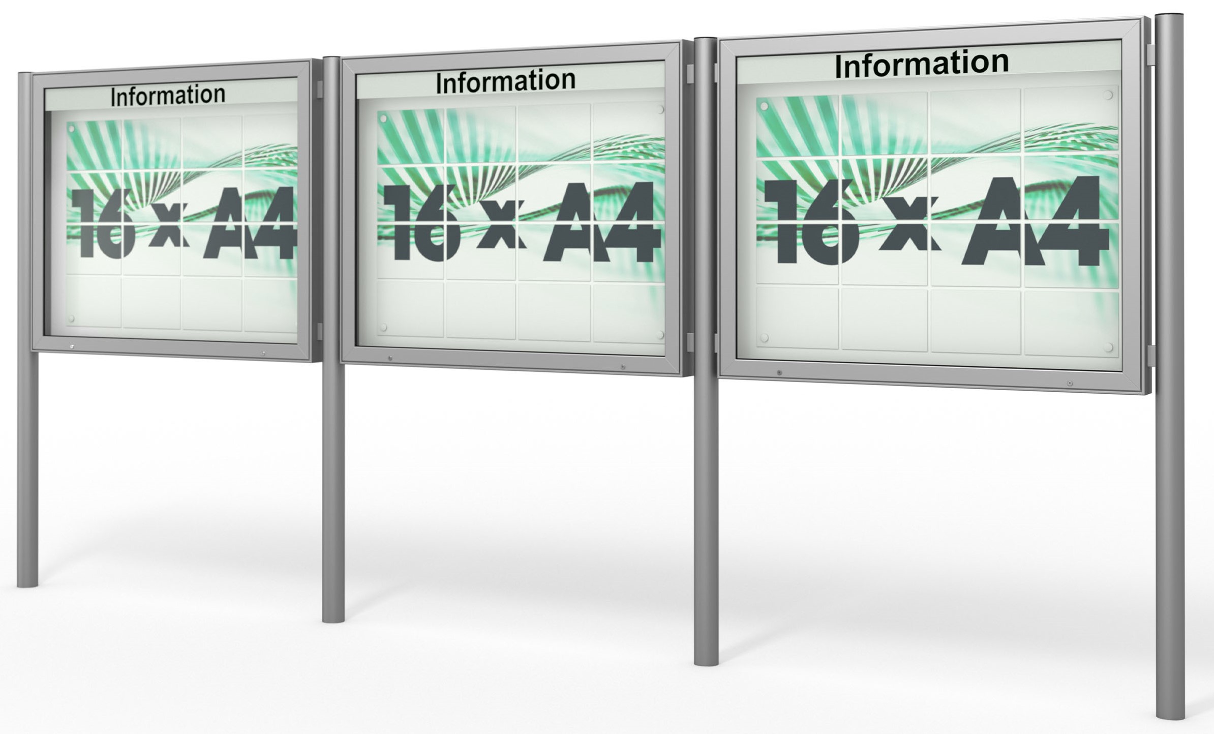 Schaukasten Plenum - eckig - 3er Reihenanlage 100 mm Gehäusetiefe -wetterfester, robuster SchaukastenUmfangreiches Zubehör wie Beleuchtung und StänderGrößen B/H3 x 16 × DIN A4 • 1330 × 1080 mm oder3 x 21 × DIN A4 • 1600 × 1130 mm Oberfläche - Eloxierung in matt-silber (E6/EV1)Optionale Standbeine - Die Standbeine müssen 700 mm tief in Betonfundamente eingefasst werdenBeleuchtung – optionale LED-Langfeldleuchte Öffnung - Nach oben öffnender Klappflügel, unterstützt durch Gasdruckfedern mit automatischer Arretierung in geöffneter StellungVerglasung - Einscheiben-Sicherheitsglas / ESG Textblende - unbeschriftete, weiße Acryl-TextblendeSchließung - Sicherheitsschlösser mit je 2 SchlüsselnMontage - Vorgerichtet zur Wandmontage - freistehend mit runden Standbeinen zum EinbetonierenRückwand - weiße, magnethaftende Rückwand mit 10 Magneten